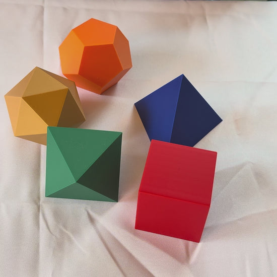 Discover the beauty of geometry with this beautiful set of platonic solids: the dodecahedron, icosahedron, octahedron, tetrahedron, the cube (hexahedron) in bright vibrant colors. They inspire - they gives you a sophisticated feeling holding them, seeing them and just having them around. They are both mathematics and art. They look great on desktops, and in workplaces and conference rooms.